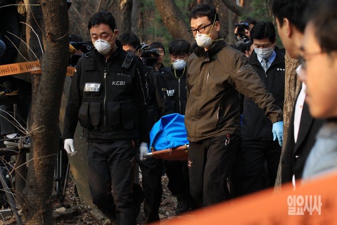 9일 오후 경찰이 북한산 형제봉 인근에서 목을 매 숨진 채로 발견된 성완종 전 경남기업 회장의 시신을 옮기고 있다.