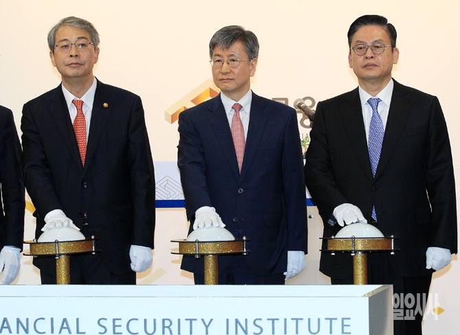 임종룡 금융위원장(왼쪽부터), 김영린 금융보안원 초대 원장, 정우택 국회 정무위원장이 10일 오전 서울 여의도 금융투자협회에서 열린 금융보안원 창립기념식에서 기념촬영을 하고 있다.