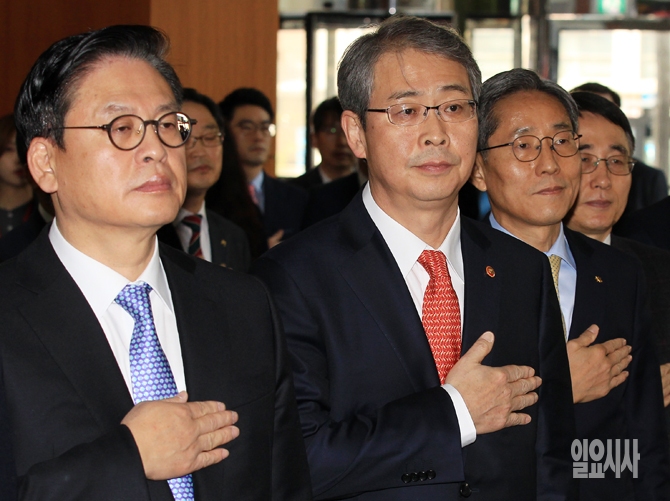 정우택 국회 정무위원장(왼쪽부터), 임종룡 금융위원장, 윤종규 KB금융그룹 회장이 10일 오전 서울 여의도 금융투자협회에서 열린 금융보안원 창립기념식에서 국민의례를 하고 있다.