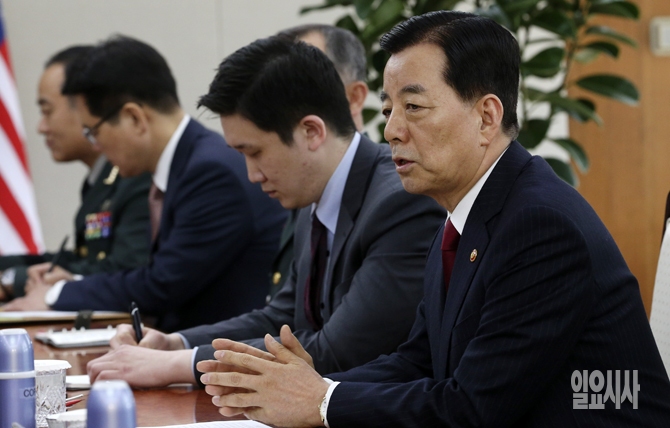 10일 오후 서울 용산구 국방부에서 열린 한-미 국방장관 대담에서 한민구 국방부 장관이 모두발언을 하고 있다.