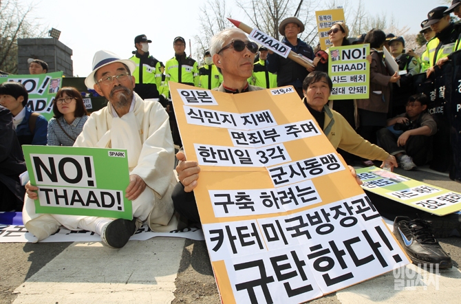 '평화와통일을여는사람들'을 비롯한 시민단체 회원들이 10일 오전 서울 용산 국방부 앞에서 한반도 사드배치를 반대하는 문구가 새겨진 피켓을 들고 앉아있다.