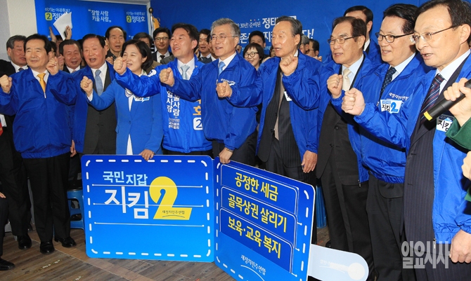 새정치민주연합 문재인 대표와 4·29 재보궐 선거 관악을에 출마하는 정태호 후보가 10일 오후 서울 관악구 정 후보 선거 사무소에서 열린 선거대책위 출범식에서 공약을 발표한 뒤 주요 인사들과 함께 기념촬영을 하고 있다.