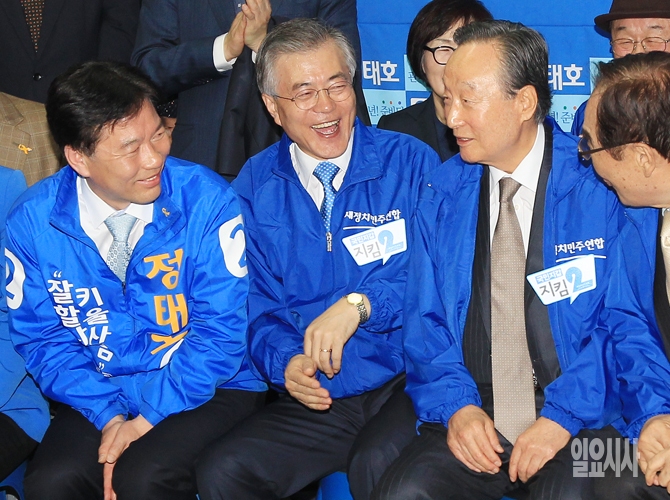 4·29 재보궐 선거 관악을에 출마하는 새정치민주연합 정태호 후보와 문재인 대표, 권노갑 상임고문이 10일 오후 정 후보의 선거사무소에서 열린 선거대책위 출범식에서 대화를 나누고 있다.