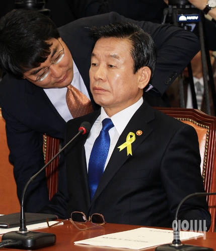 박인용 국민안전처 장관이 13일 오전 서울 여의도 국회에서 열린 새누리당 최고위원회의에 세월호 희생자들을 추모하는 뜻으로 노란리본을 달고 참석하고 있다.