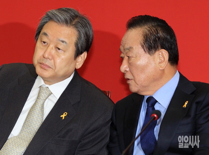 새누리당 김무성 대표와 서청원 최고위원이 13일 오전 서울 여의도 국회에서 열린 당 최고위원회의에서 대화를 나누고 있다.