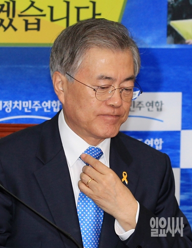 새정치민주연합 문재인 대표가 13일 오전 서울 여의도 국회에서 열린 당 최고위원회의에 참석해 넥타이를 가다듬고 있다.