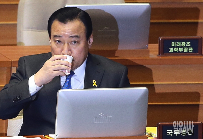 13일, 서울 여의도 국회 본회의장서 열린 국회 대정부질문 첫째날, 이완구 국무총리가 대기석에서 대기하던 중 물을 들이키고 있다.