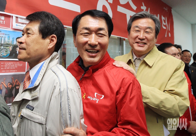 13일 오후 새누리당 인천 서·강화을에 나가는 안상수 후보의 선거사무소에서 열린 '인천시당 선거대책위원회 검단·강화 경제 살림꾼 새줌마 발대식'에서 김무성 대표가 안 후보의 어깨를 주무르고 있다.