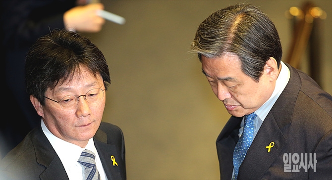 14일, 서울 여의도 국회 본회의장에서 열린 대정부질문 둘째 날, 새누리당 김무성 대표와 유승민 원내대표가 최근 폭로된 '성완종 리스트'와 관련해 어두운 표정을 짓고 있다.