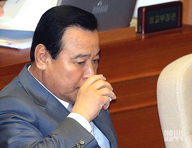 14일, 서울 여의도 국회 본회의장에서 열린 대정부질문 둘째 날, 외교·안보분야 질의 도중 이완구 국무총리가 대기석에서 목이 타는 듯 물을 들이키고 있다.