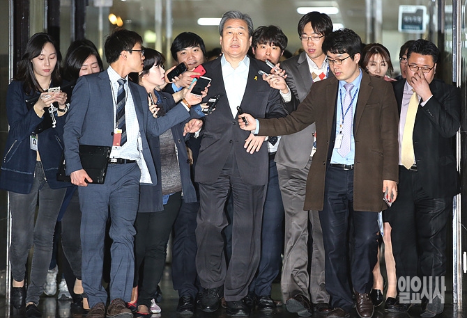 14일, 서울 여의도 국회서 새누리당 비공개 의원총회 직후 김무성 대표가 취재진에게 둘러싸여 질문세례를 받고 있다.