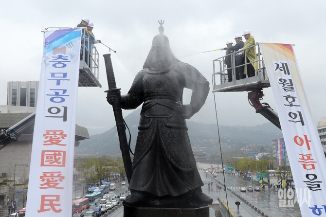 [포토] 이순신 장군 동상 친수식, '팽목항의 물로..'