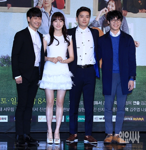 배우 지일주(왼쪽부터), 한보배, 인교진, 진선규가 14일 오후 서울 상암동 MBC 미디어센터에서 열린 주말드라마 <여자를 울려> 제작발표회에서 포즈를 취하고 있다.