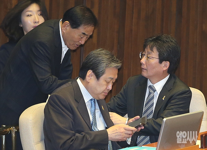 14일, 서울 여의도 국회 본회의장에서 외교·통일·안보 분야 대정부질문 직전 김무성 대표가 스마트폰을 확인하고 있는 가운데, 새누리당 유승민 원내대표와 이재오 의원이 반갑게 인사를 나누고 있다.