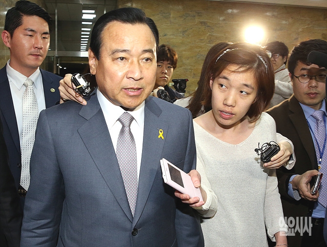 14일, 서울 여의도 국회 본회의장서 열린 외교·통일·안보분야 국회 대정부질문 직후, 최근 '성완종 리스트'를 통해 지난 2013년 재보선 당시 불법정치자금을 받은 것으로 알려진 이완구 국무총리가 취재진의 질문에 답변하고 있다.