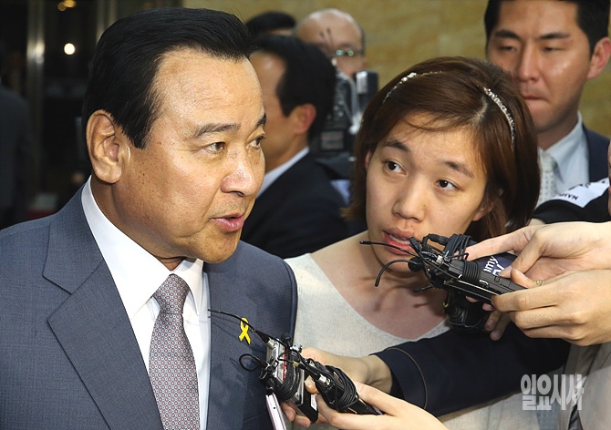 14일, 서울 여의도 국회 본회의장서 열린 외교·통일·안보분야 국회 대정부질문 직후, 최근 '성완종 리스트'를 통해 지난 2013년 재보선 당시 불법정치자금을 받은 것으로 알려진 이완구 국무총리가 취재진의 질문에 답변하고 있다.