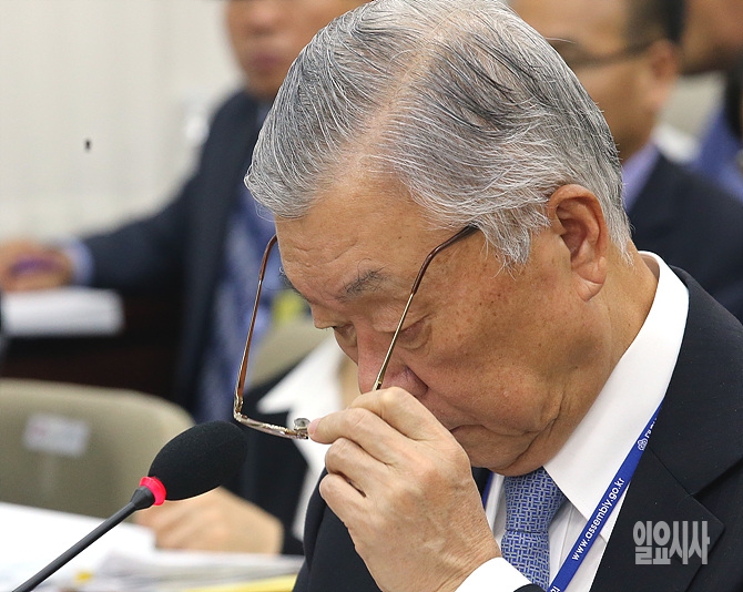 22일, 서울 여의도 국회 보건복지위원회 회의실에서 열린 건강보험심사평가원 등에 대한 국정감사 도중 성상철 국민건강보험공단 이사장이 안경을 벗고 있다.