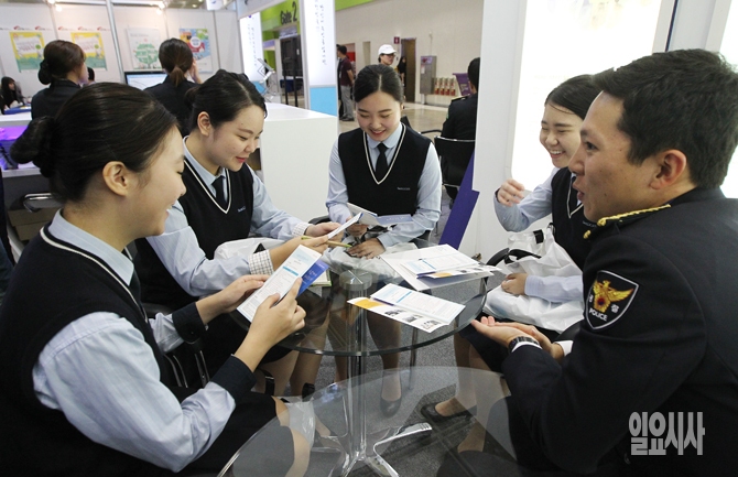 공직박람회를 찾은 학생들이 23일 오전 서울 삼성동 코엑스에서 열린 '2015 공직박람회' 경찰청 부스에서 상담을 하고 있다. 인사혁신처의 주최로 열린 이번 공직박람회는 70여개의 기관이 참가했으며 23~24일 이틀간 열릴 예정이다.