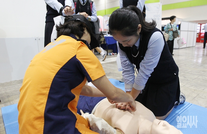 공직박람회를 찾은 학생이 23일 오전 서울 삼성동 코엑스에서 열린 '2015 공직박람회' 소방방재청 부스에서 심폐소생술 체험을 하고 있다. 인사혁신처의 주최로 열린 이번 공직박람회는 70여개의 기관이 참가했으며 23~24일 이틀간 열릴 예정이다.