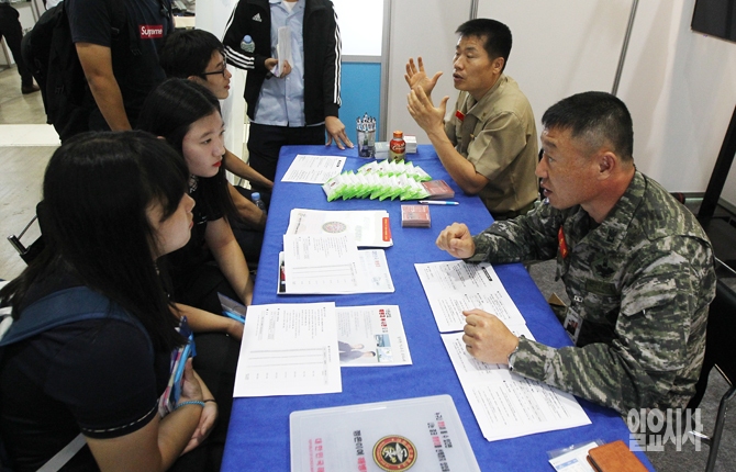 공직박람회를 찾은 학생들이 23일 오전 서울 삼성동 코엑스에서 열린 '2015 공직박람회' 해병대 부스에서 상담을 하고 있다. 인사혁신처의 주최로 열린 이번 공직박람회는 70여개의 기관이 참가했으며 23~24일 이틀간 열릴 예정이다.