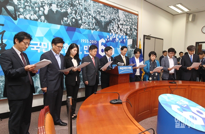 새정치민주연합 혁신위원회 소속 위원들이 23일 오후 서울 여의도 국회에서 열린 당 혁신위 기자회견에서 마지막 혁신안을 돌아가면서 발표하고 있다.