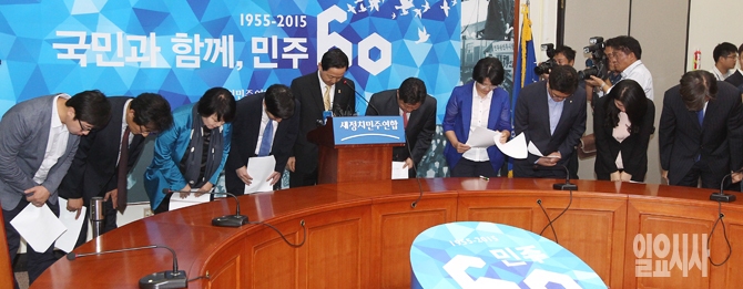 김상곤 새정치민주연합 혁신위원장과 혁신위 소속 위원들이 23일 오후 서울 여의도 국회에서 열린 당 혁신위원회 기자회견에서 인사를 하고 있다.