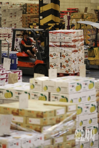 민족의 대명절 추석이 나흘 앞으로 다가온 가운데 23일 오후 서울 송파구 가락청과물도매시장에 추석 대목을 맞아 가득 쌓인 과일상자들을 지게차가 분주하게 나르고 있다.