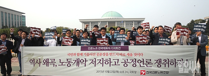 22일, 서울 여의도 국회에서 전국언론노조 관계자들이 '교과서 역사 왜곡·노동개악 저지 기자회견을 갖고 있다.