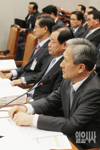 이영재 대통령경호실 차장 직무대리, 이병기 대통령비서실장, 김관진 국가안보실장이 23일 오전 서울 여의도 국회에서 열린 국회 운영위원회의 대통령비서실 등에 대한 국정감사에 출석해 있다.
