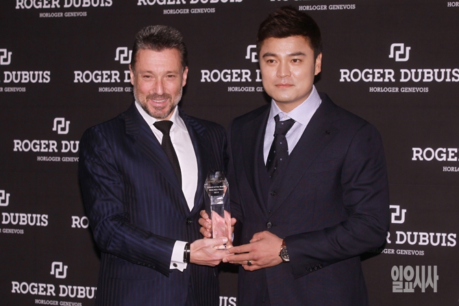 장 마크 폰트로이 로저드뷔 브랜드 CEO가 25일 오후 서울 강남구 인터와이어드 스튜디오에서 열린 세계적인 스위스 명품시계 브랜드 '로저드뷔(ROGERDUBUIS)'의 메이저리거 추신수 브랜드 친선대사 위촉식에서 메이저리그 테사스 레인저스의 추신수 선수에게 위촉패를 전달하고 있다.
