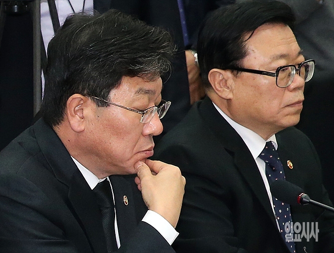 25일, 새누리당 정책위원회(위원장 김정훈)가 서울 여의도 국회서 한중FTA 관련 긴급간담회를 연 가운데, 윤상직 산업통상자원부장관이 잠시 고민에 빠져 있다.