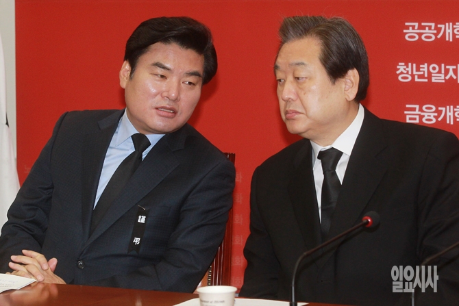 새누리당 김무성 대표와 원유철 원내대표가 26일 오전 서울 여의도 국회에서 열린 새누리당 최고위원회의에서 대화를 나누고 있다.