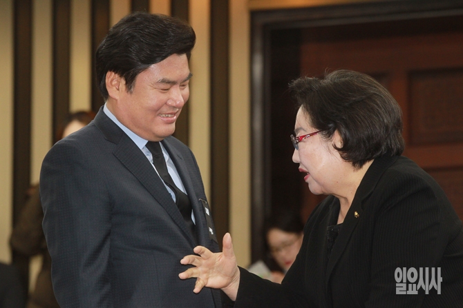 새누리당 원유철 원내대표와 김을동 최고위원이 26일 오전 서울 여의도 국회에서 열린 새누리당 의원총회에서 대화를 나누고 있다.