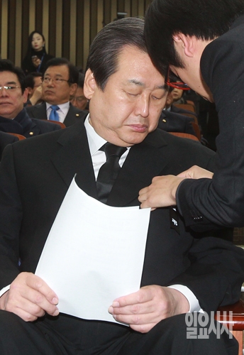 김무성 새누리당 대표가 26일 오전 서울 여의도 국회에서 열린 새누리당 의원총회에서 근조 리본을 착용하고 있다.