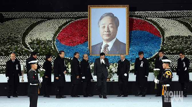 26일, 서울 여의도 국회 본청 앞에서 열린 고 김영삼 전 대통령 국가장 영결식 도중 헌화 후 무거운 분위기 속에 발걸음을 옮기고 있다.