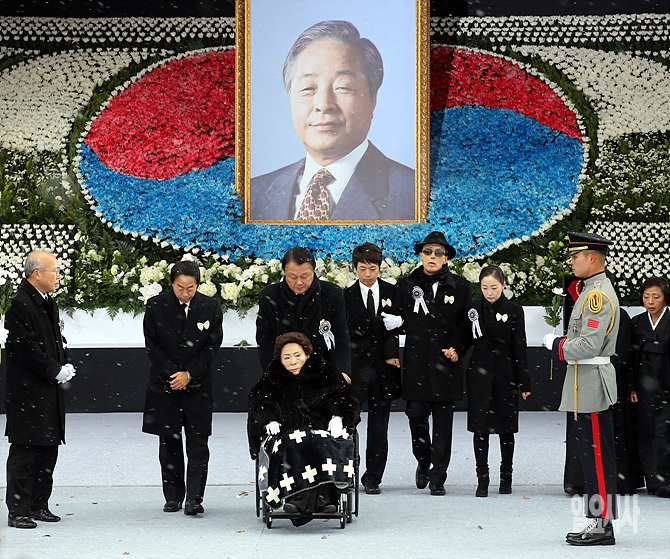 26일, 서울 여의도 국회 본청 앞에서 열린 고 김영삼 전 대통령 국가장 영결식 도중 손명순 여사가 장남 은철씨(사진 오른쪽서 두 번째), 차남 현철씨(왼쪽서 두 번째) 등과 함께 헌화 후 이동하고 있다.
