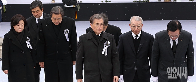 26일, 서울 여의도 국회 본청 앞에서 고 김영삼 전 대통령 국가장 영결식이 엄수된 가운데, 정의화 국회의장, 김무성·문재인 여야 대표, 정의당 심상정 대표 등이 헌화 후 침통한 표정을 짓고 있다.