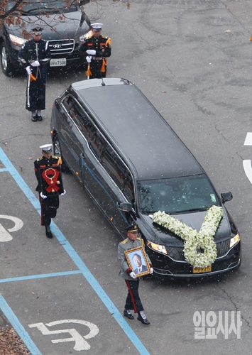 눈이 내리고 있는 가운데 26일 오후 서울 여의도 국회에서 열린 고 김영삼 전 대통령의 영결식에서 고인의 영정과 고인을 태운 운구차량이 영결식장으로 들어서고 있다. (사진공동취재단)