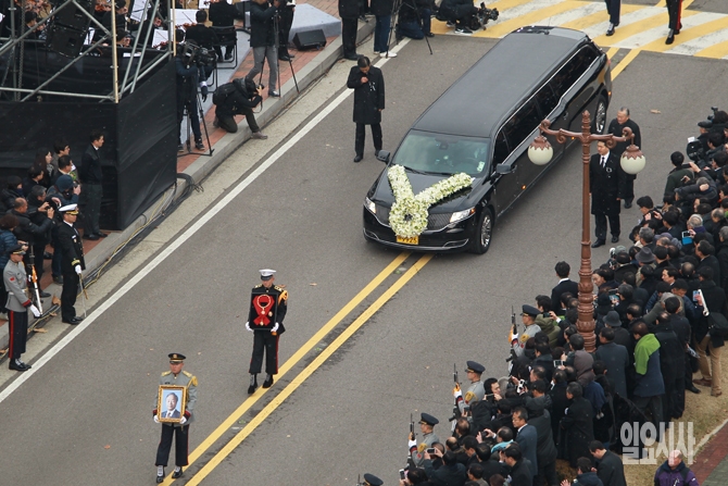 26일 오후 서울 여의도 국회에서 열린 고 김영삼 전 대통령의 영결식 후 고 김영삼 전 대통령의 영정과 고인을 태운 운구차량이 영결식장을 나서고 있다. (사진공동취재단)