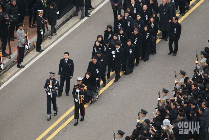 26일 오후 서울 여의도 국회에서 열린 고 김영삼 전 대통령의 영결식 후 유가족들이 운구차량을 따라 영결식장을 나서고 있다. (사진공동취재단)