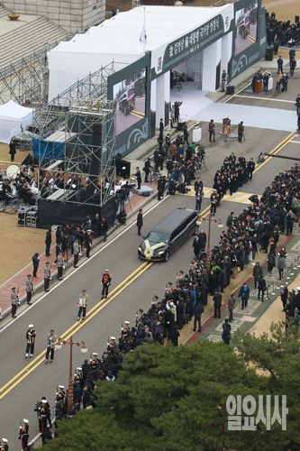 26일 오후 서울 여의도 국회에서 열린 고 김영삼 전 대통령의 영결식 후 고 김영삼 전 대통령의 운구차량과 유가족들이 영결식장을 나서고 있다. (사진공동취재단)