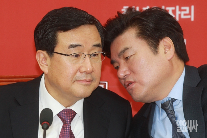 새누리당 원유철 원내대표와 김정훈 정책위의장이 27일 오전 서울 여의도 국회에서 열린 새누리당 원내대책회의에서 대화를 나누고 있다.