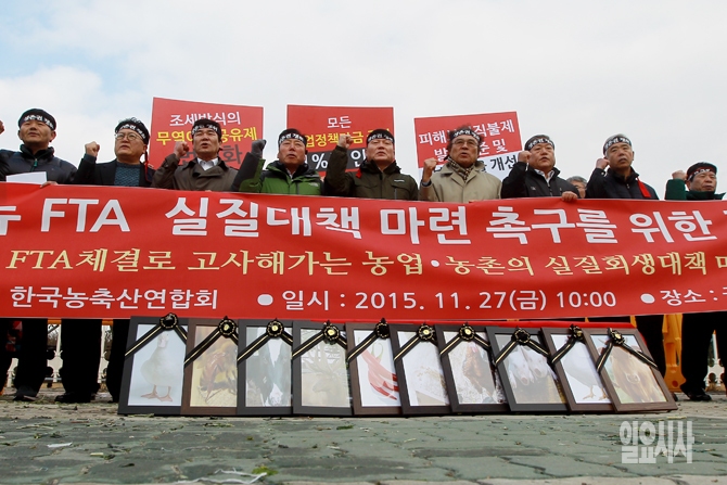 한국농축산협회 관계자들이 27일 오전 서울 여의도 국회 정문 앞에서 한·중, 베, 뉴(중국, 베트남, 뉴질랜드 ) FTA 실질대책 마련 촉구를 위한 긴급기자회견에 구호를 외치고 있다.