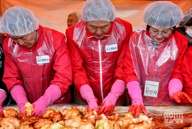김무성 새누리당 대표가 27일 오전 서울 여의도 국회에서 열린 새누리 행복봉사단 김치담그기 행사에서 김치를 담그고 있다.