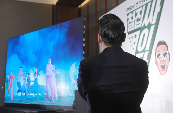 가수 싸이가 30일 오후 서울 여의도 콘래드호텔 그랜드볼룸에서 열린 싸이의 7번째 앨범 <칠집싸이다> 발매기념 기자회견에서 언론에 공개되는 자신의 뮤직비디오를 보고 있다.