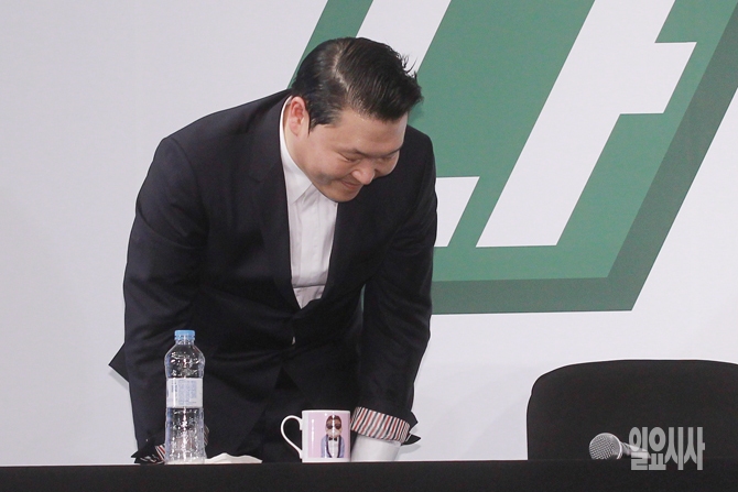 가수 싸이가 30일 오후 서울 여의도 콘래드호텔 그랜드볼룸에서 열린 싸이의 7번째 앨범 <칠집싸이다> 발매기념 기자회견에서 인사를 하고 있다.