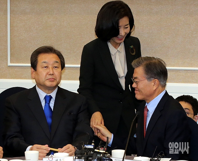 30일, 서울 여의도 국회서 열린 '한중FTA 국회비준 관련 여야회담'에서 새정치민주연합 문재인 대표와 새누리당 나경원 의원이 악수를 나누고 있다.