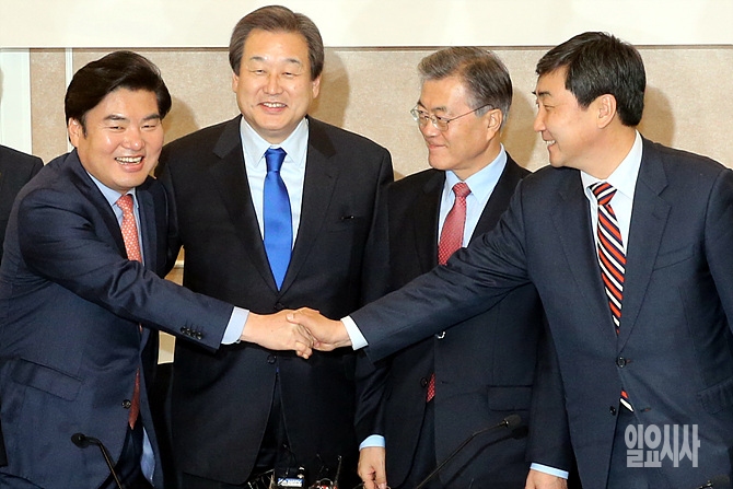 30일, 서울 여의도 국회서 '한중FTA 국회비준 관련 여야회담' 직후 김무성·문재인 등 여야 지도부가 화기애애한 분위기로 악수를 나누고 있다.
