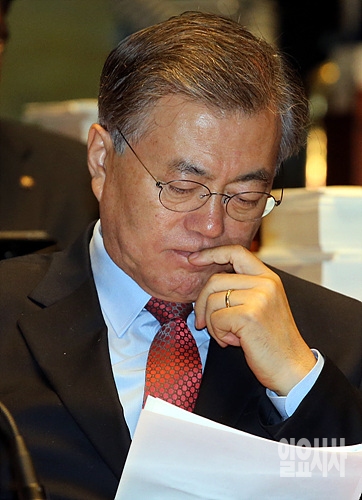 30일, 문재인 새정치민주연합 대표가 서울 여의도 국회서 열린 새정치민주연합 한중FTA 비준 관련 의원총회 도중 생각에 잠겨 있다.