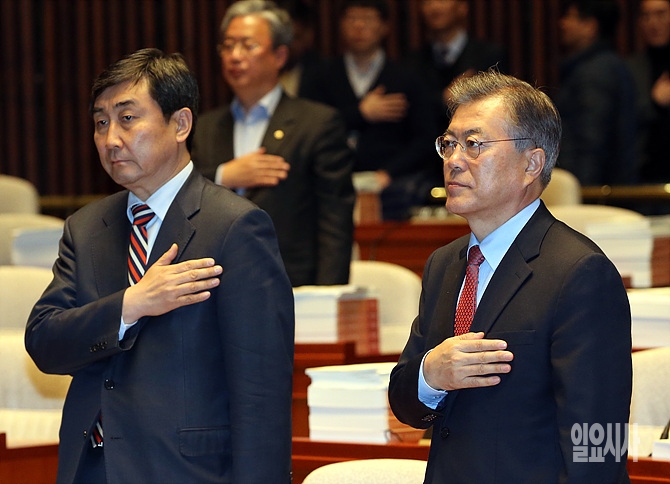 30일, 서울 여의도 국회서 열린 새정치민주연합 한중FTA 비준 관련 의원총회에 앞서 문재인 대표와 이종걸 원내대표 등 참석자들이 국기에 대한 경례를 하고 있다.